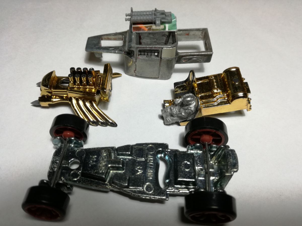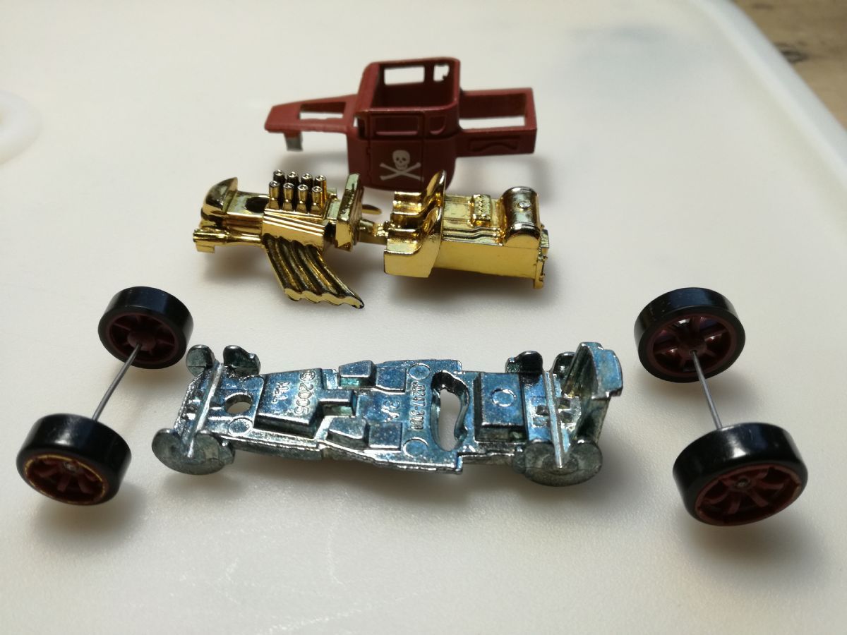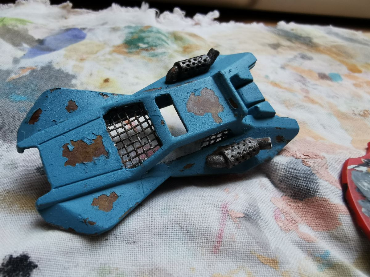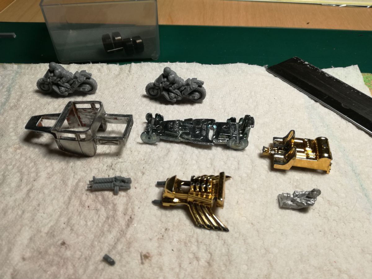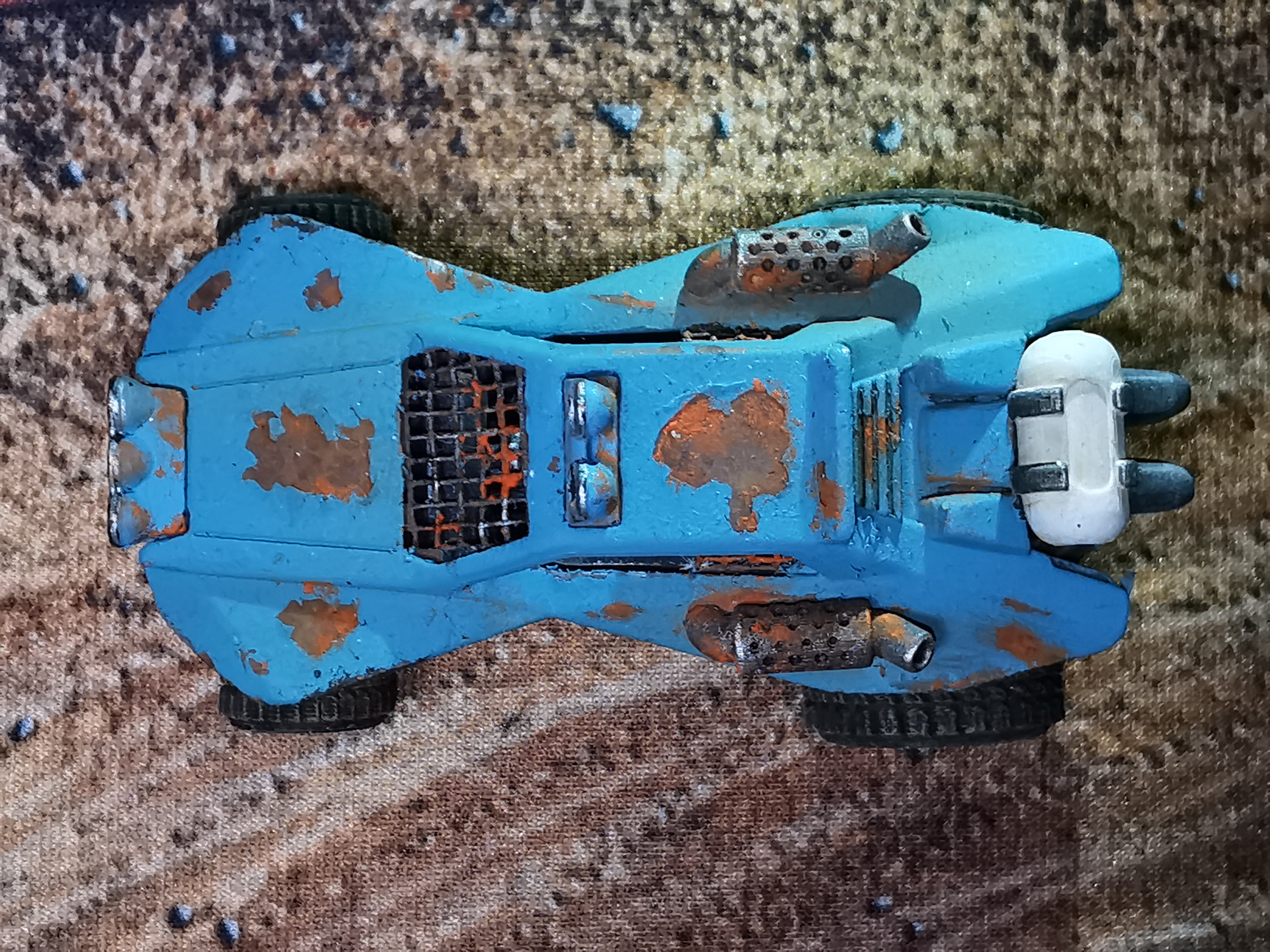 Auf das Zerlegen des Fahrzeugs folgte die Originalfarbentfernung, aufwendige Reinigungsschritte und die abschließende Politur. Letztere ist zwar in einem postapokalyptischen Szenario (Gaslands) nicht unbedingt nötig, aber eine gute Übung und eine saubere Lackierung, die man später wieder 'altern lassen' kann braucht's dann doch. Der Umbau ist noch lange nicht abgeschlossen und die Lackiererei lässt somit noch länger auf sich warten.