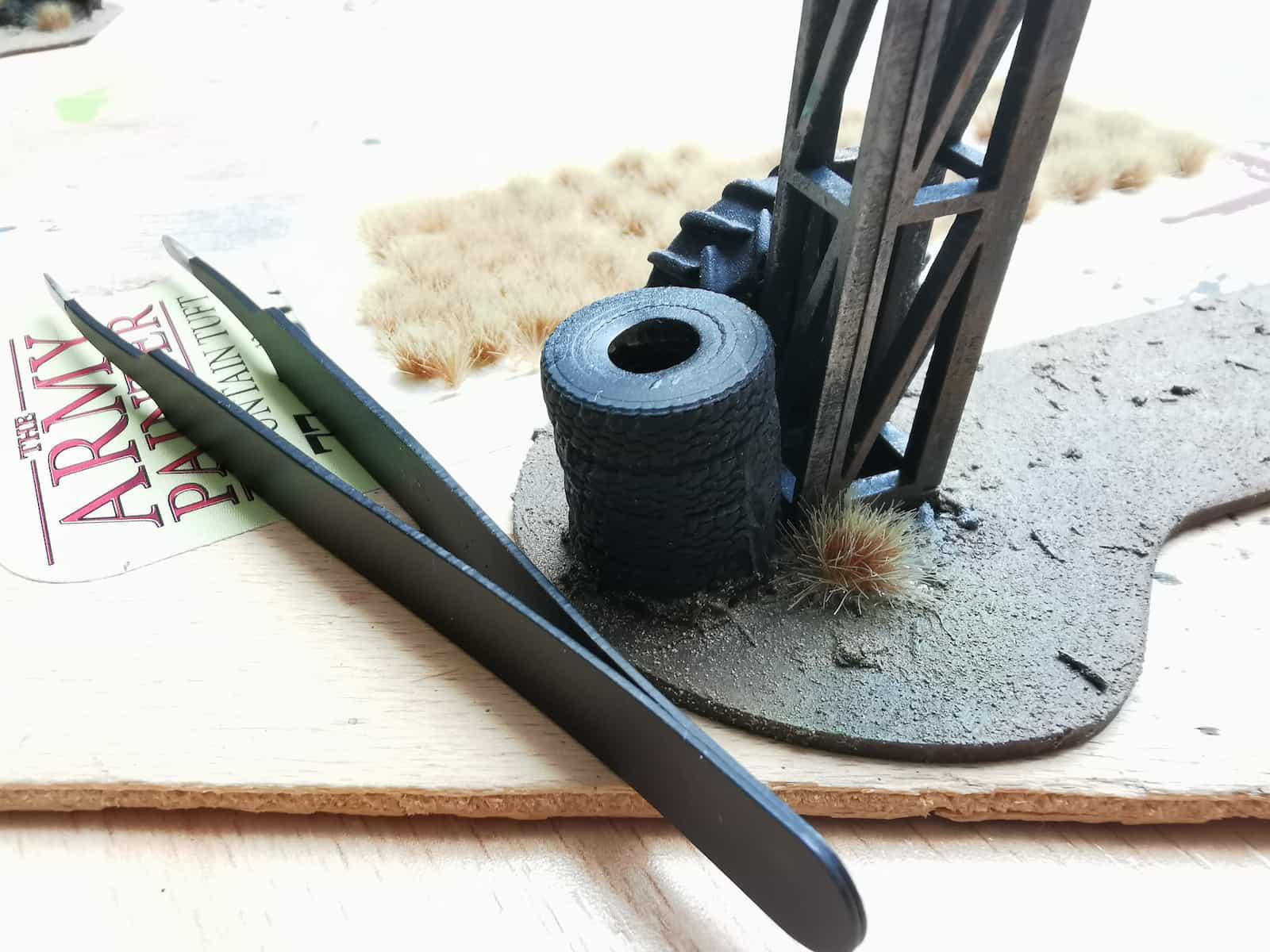 Die MDF-Platten wurden vor der weiteren Bearbeitung entsprechend vorbehandelt. Tipps und Tricks für die optimale Nutzung von MDF findet ihr im Artikel MDF first timer - Für Necromunda & Co.. Sämtliche Bodenplatten wurden seitlich zum Boden mit Feile und Sandpapier leicht abgerundet. Auf den Bodenplatten brachte ich meine Eigenmischung an Textur-Sand und Kies unterschiedlicher Größen auf. Danach wurden alle Teile mit schwarzer Airbrush-Grundierung von Vallejo besprüht. Nun fanden noch etwas größere Steine ihren Platz an den Füßen der Eisenträger. Daraufin folgten bei den Bodenplatten zwei Schichten Thick Mud von Vallejo.
