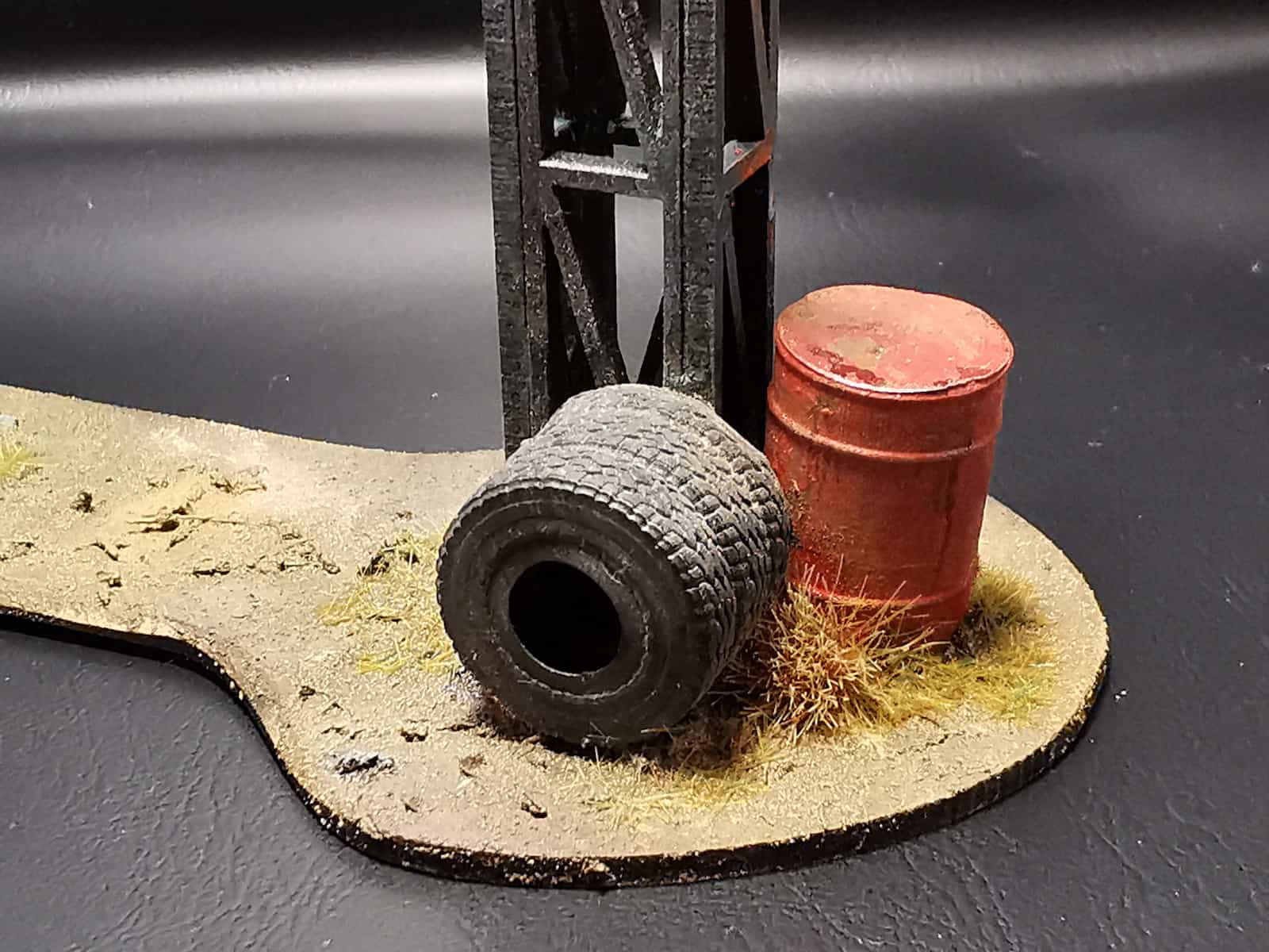Nach dem Alkoholspülen und Härten wurden die Reifen und die Fässer mit dem Airbrush schwarz und die Kanister grau grundiert.