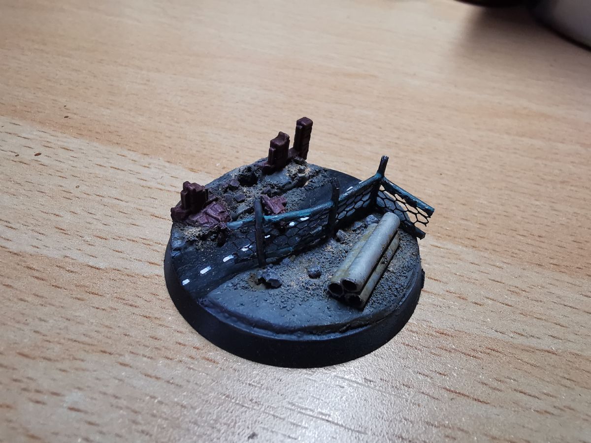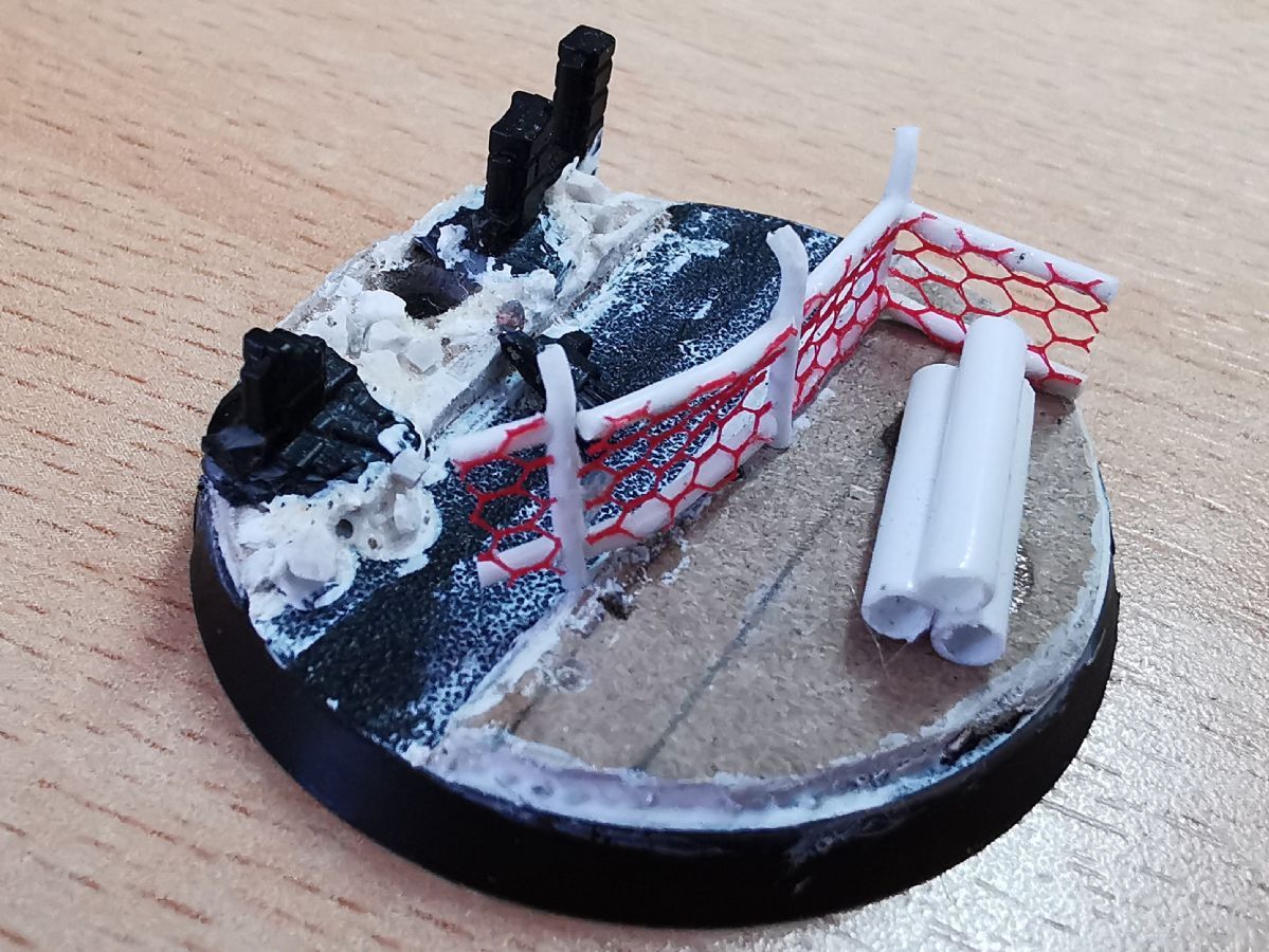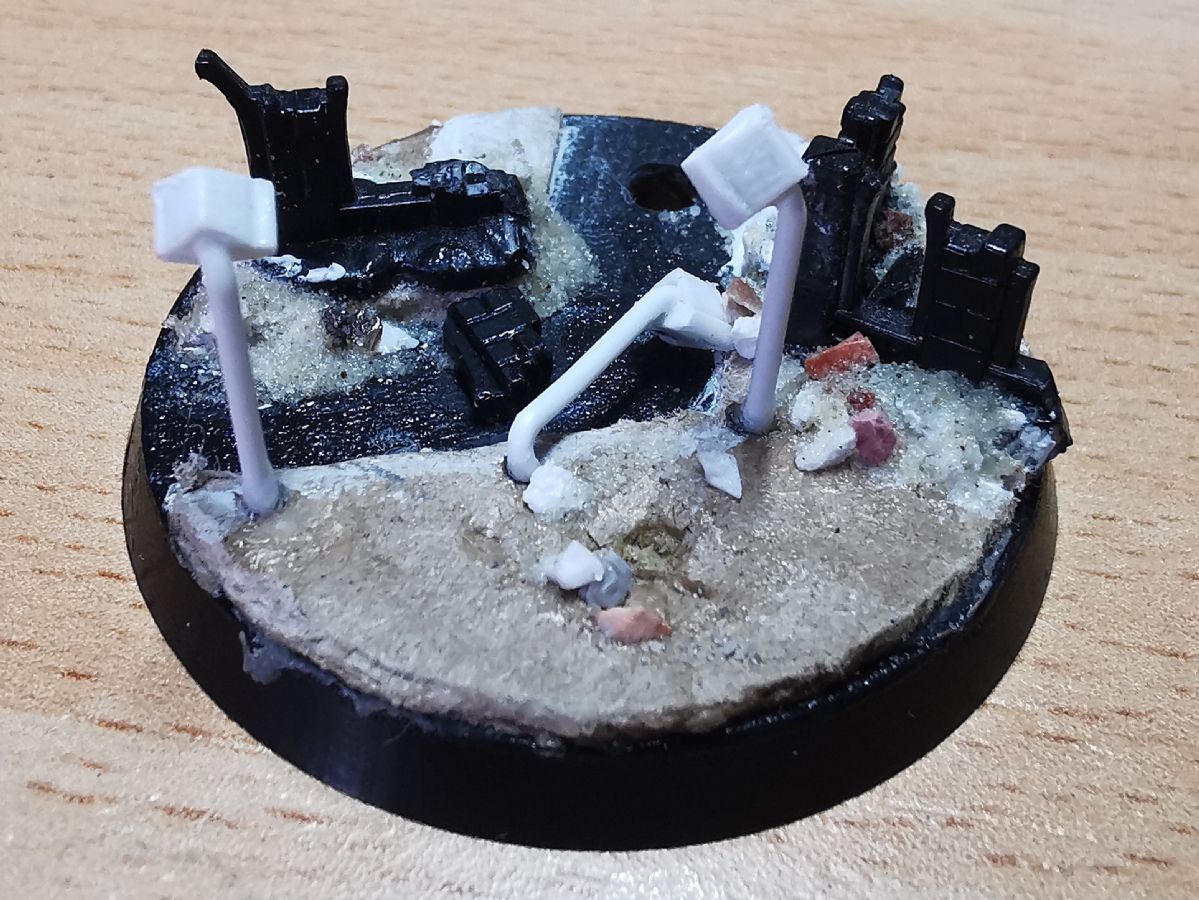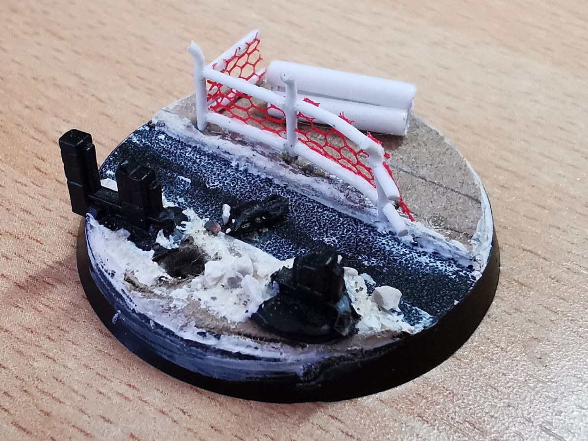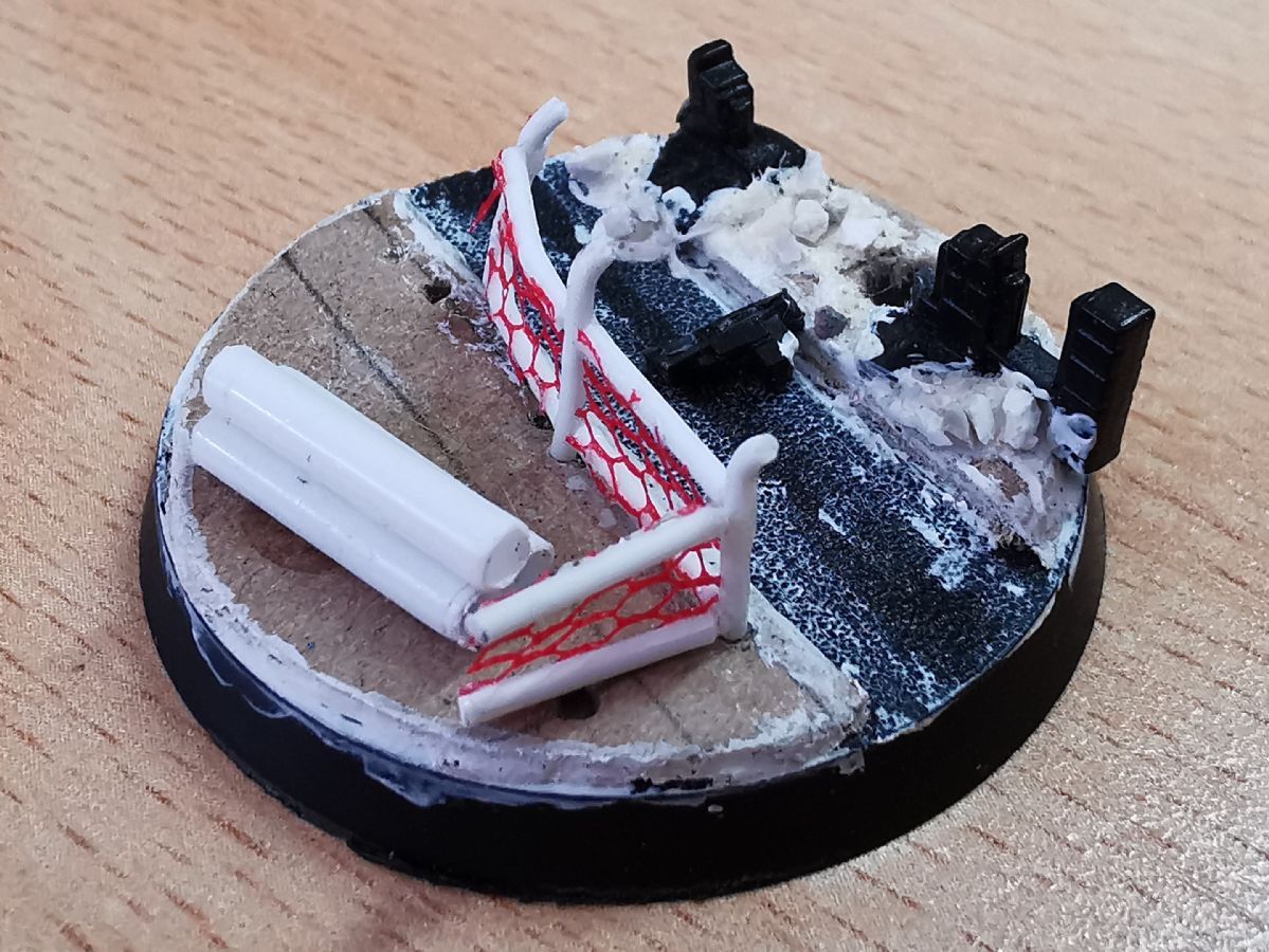 Die alten Bases waren wirklcih rasch und lieblos umgesetzt. Da sollen die neuen runden Varianten doch etwas mehr bieten. Gut erkannt. Der Zaun wird nach der ersten Bemalphase der Base aufgebracht. Die Bases hab ich ganz bewusst mit Polystyrene und "klassischen" Methoden gemacht. Erstens kommen in Kürze Frostgrave-Figuren und Treasure-Tokens aus dem 3D-Drucker und zweitens wollte ich für die Gasland-Boliden etwas üben. Dafür verwende ich auch Polystyrene, das ich noch nicht so gut kenne und daher Übung benötige.