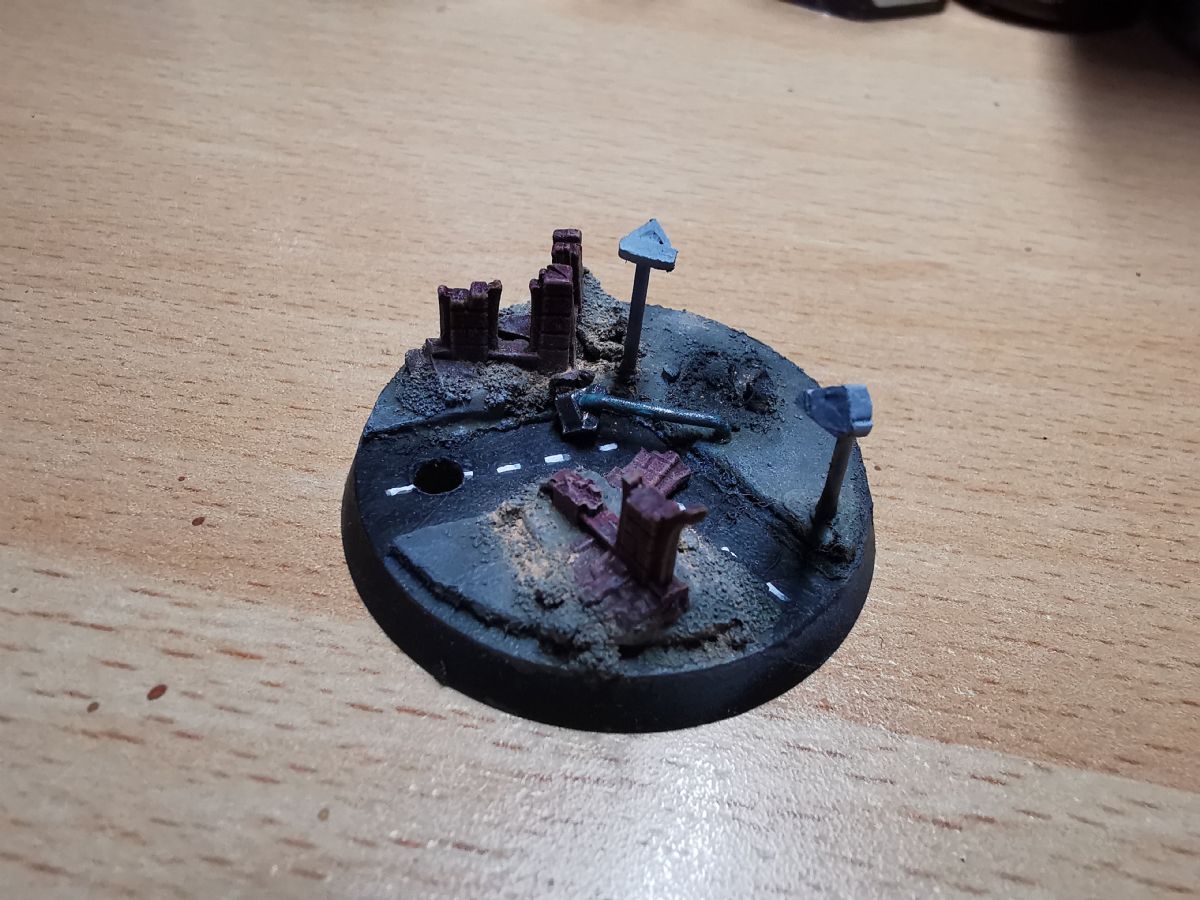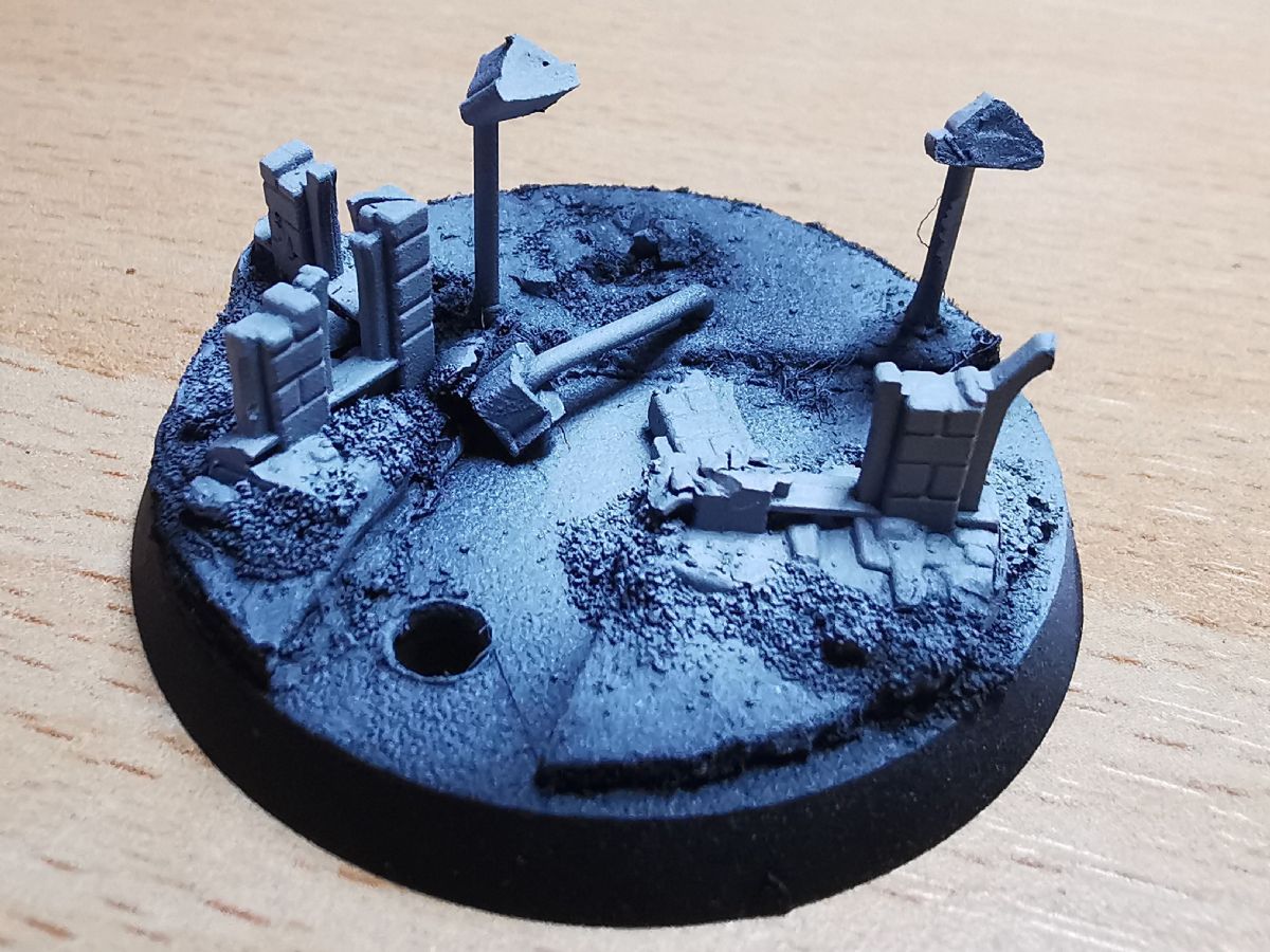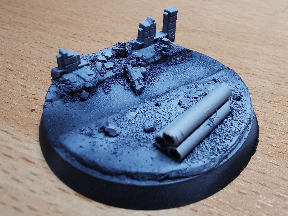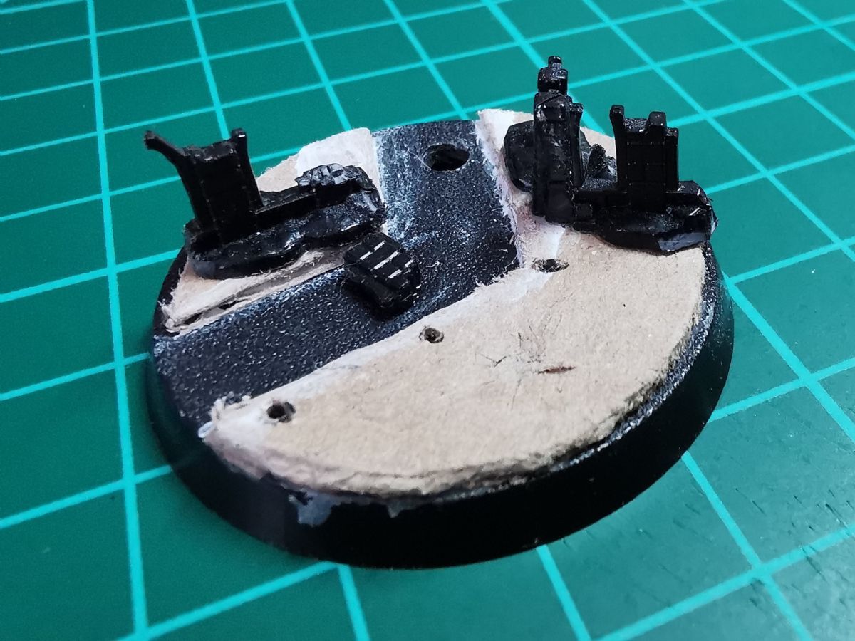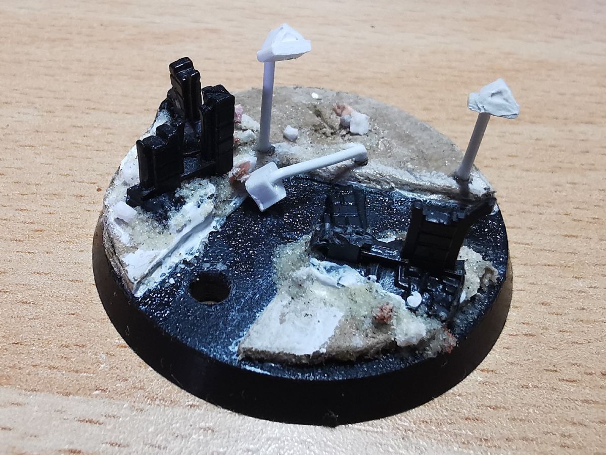 Die alten Bases waren wirklcih rasch und lieblos umgesetzt. Da sollen die neuen runden Varianten doch etwas mehr bieten. Gut erkannt. Der Zaun wird nach der ersten Bemalphase der Base aufgebracht. Die Bases hab ich ganz bewusst mit Polystyrene und "klassischen" Methoden gemacht. Erstens kommen in Kürze Frostgrave-Figuren und Treasure-Tokens aus dem 3D-Drucker und zweitens wollte ich für die Gasland-Boliden etwas üben. Dafür verwende ich auch Polystyrene, das ich noch nicht so gut kenne und daher Übung benötige.
