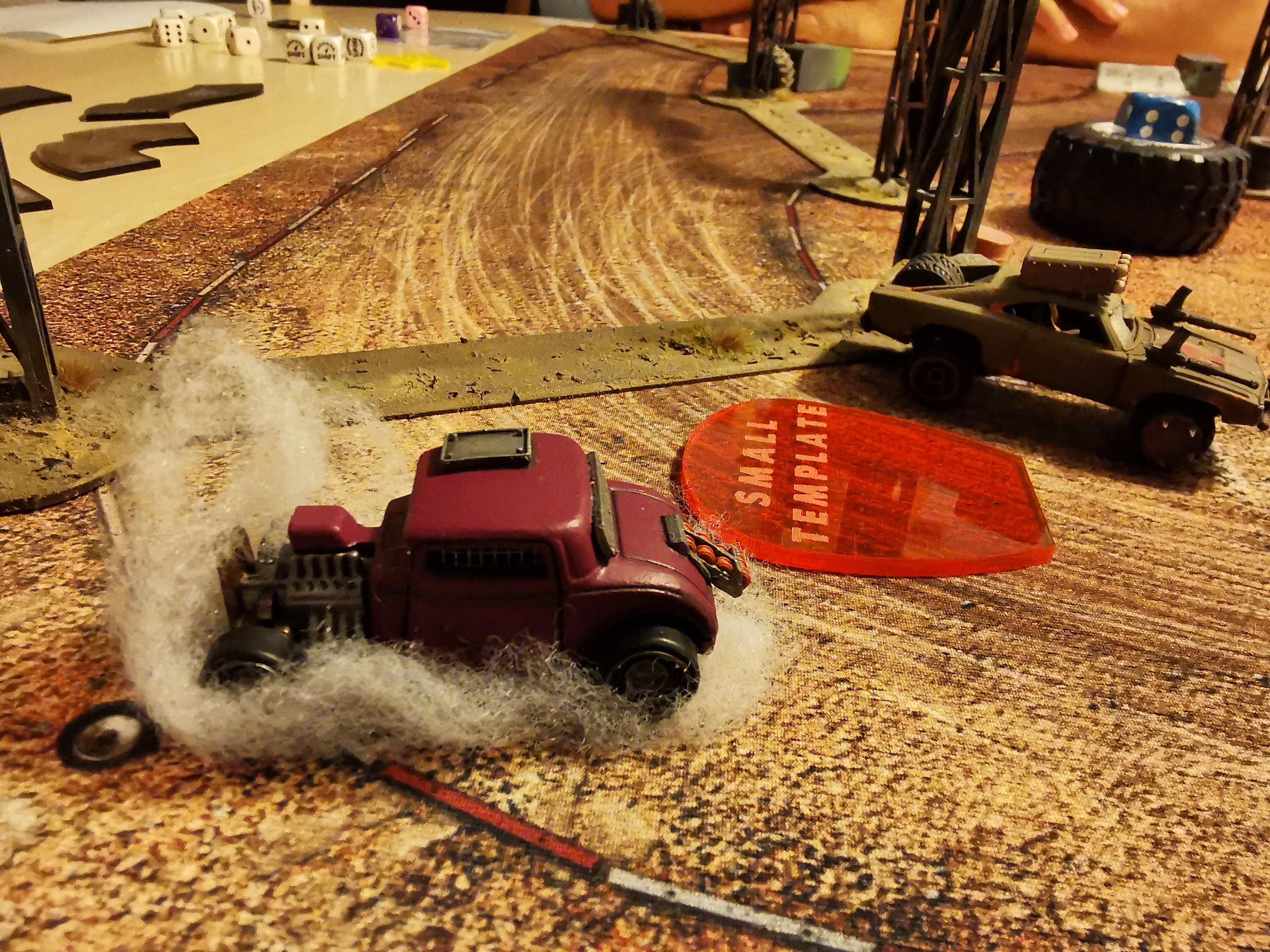 Unter tosendem Applaus der Menge steuert der Dodge in einem perfekten Manöver zwischen Napalm und den metallenen Streben des ersten Tores hindurch und beschleunigt, um zum vor ihm fahrenden Buggy aufzuschließen. Wutentbrannt setzt HotPin mit seinem Skullhammer zurück und setzt sich erneut als nun Letzter in Bewegung. Ein brutales Lächeln verzerrt kurz darauf sein Gesicht, als er seine Chance erkennt. Die Läufe des schweren MG's verfärben sich unter der hohen Temperatur des Blei-spuckenden Angriffs. Das Heck des 70'er Dodge Chargers wird von den Salven und den großen Projektilen geradezu zerfetzt. Als Teile des Wagens in Flammen aufgehen, detonieren die letzten beiden Raketenladungen am Dach des Wagens und dieser geht in einem feuerroten Feuerball auf. Die Welle dieser gewaltigen Explosion erschüttert auch den eigentlich weit vorausfahrenden nichts-ahnenden Buggy "Lupus", der damit ebenfalls zu stehen kommt.