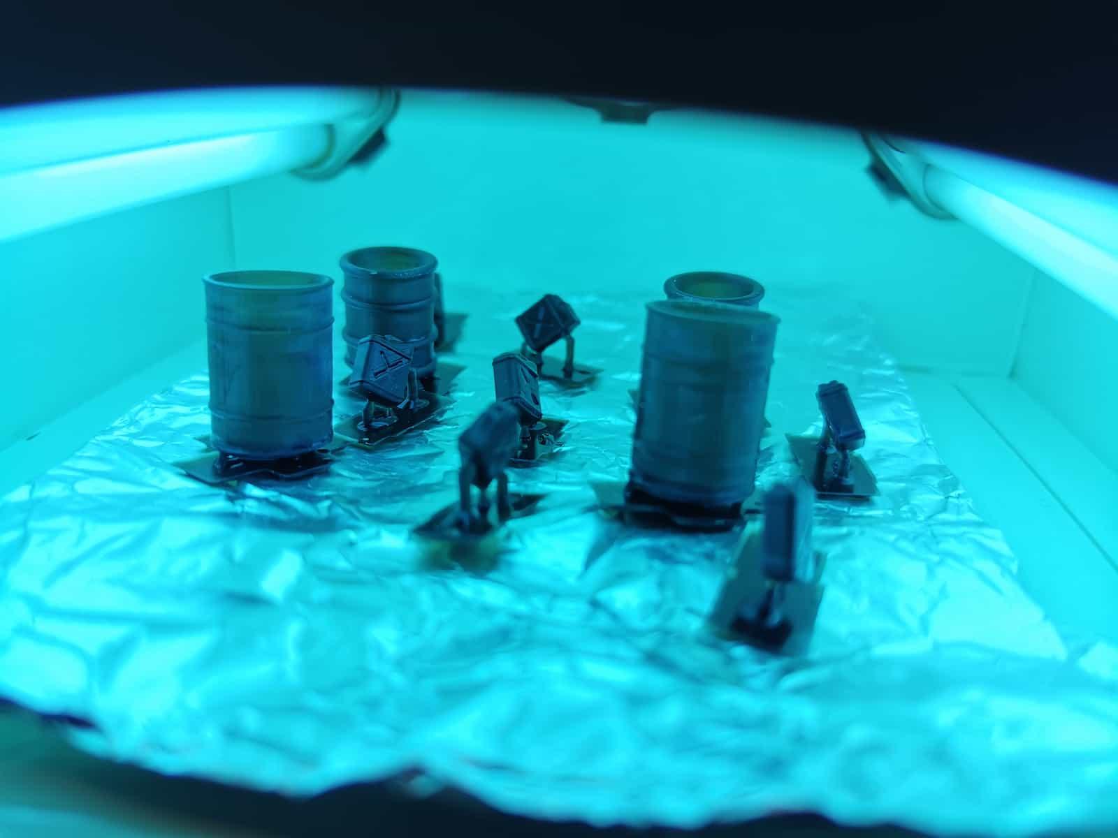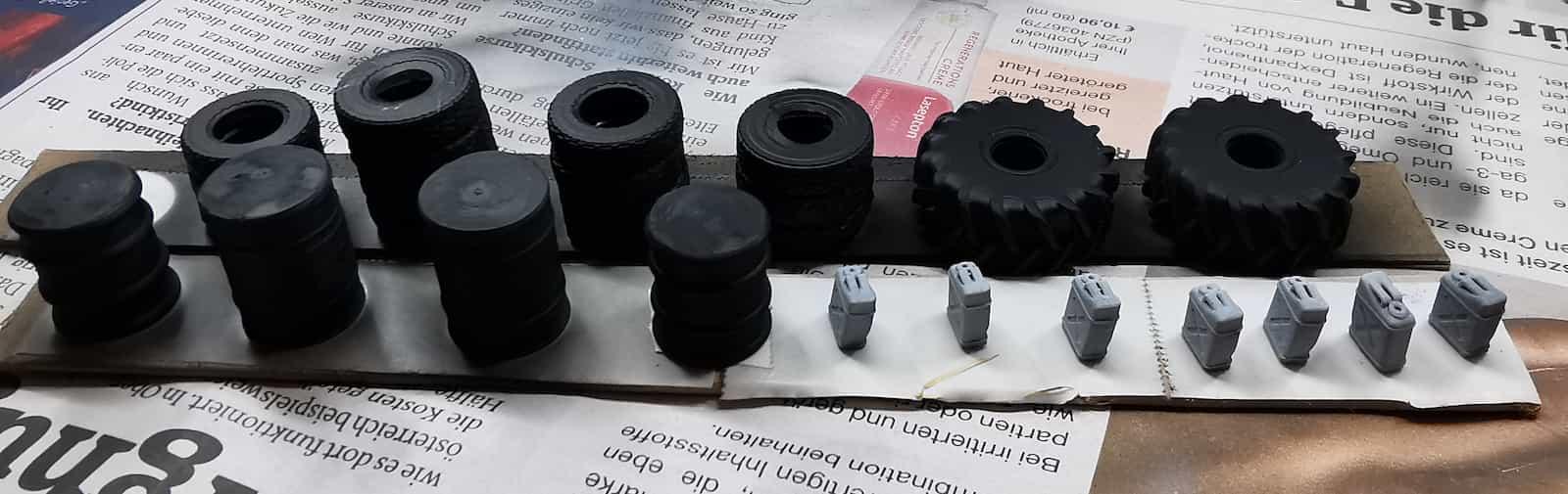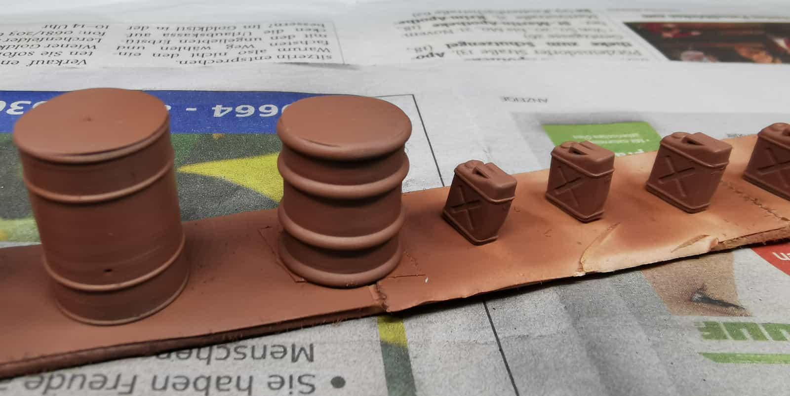 Nach dem Alkoholspülen und Härten wurden die Reifen und die Fässer mit dem Airbrush schwarz und die Kanister grau grundiert.