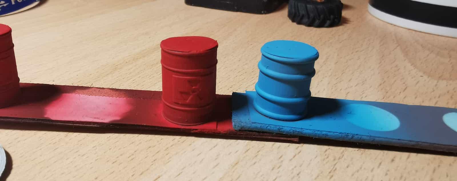 Nun folgten die Grundfarben. Diese waren Rot und Blau für die Fässer. Gelb stand kurz ebenfalls zur Auswahl, wurde dann jedoch wieder, frei nach dem Motto "Weniger ist mehr", fallen gelassen. Die Farbwahl fiel aus Gründen der Verfügbarkeit erneut auf Citadel-Farben.