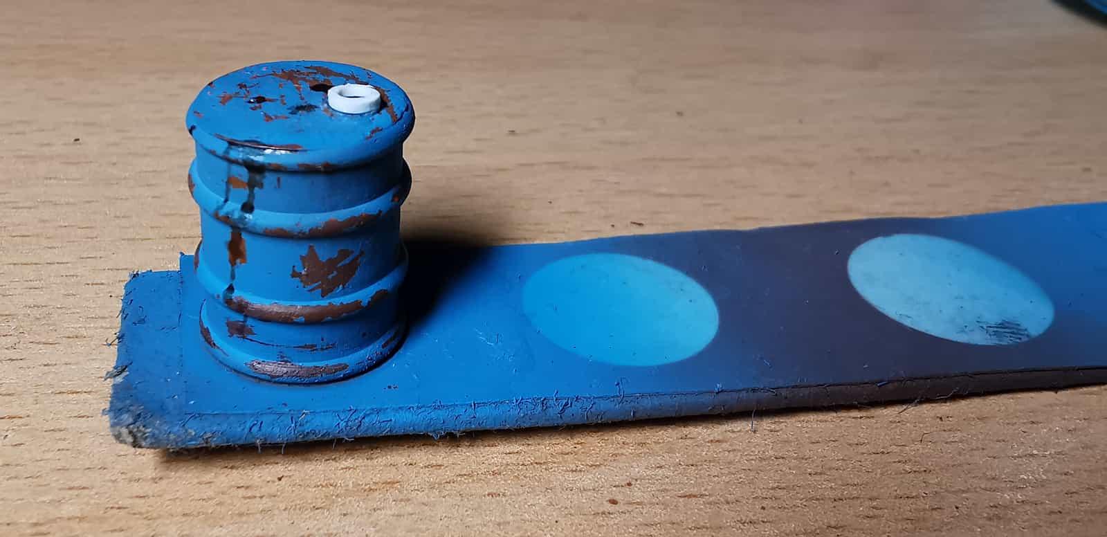 Nachdem ich dann noch eine weitere Idee zu der Positionierung der Fässer hatte, brachte ich kurzerhand einen Ausgussstutzen am Deckel eines der Fässer an. Dafür nutzte ich einen kurzen Abschnitt eines 2,5 mm Selitron-Rohres. Nach den Aufnahmen unten wurde dieser Stutzen natürlich in Fassfarbe nachgefärbt.