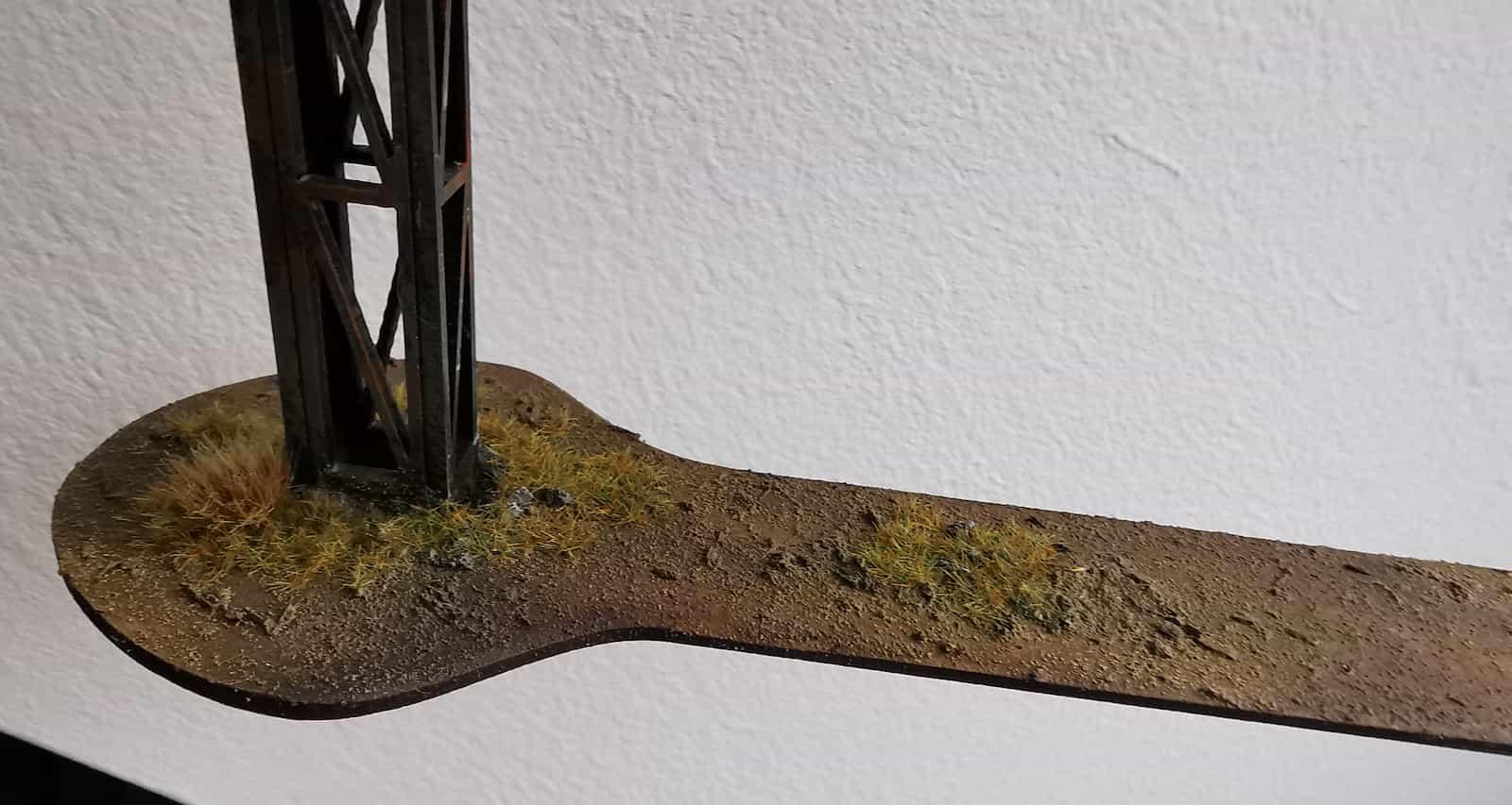 Die MDF-Platten wurden vor der weiteren Bearbeitung entsprechend vorbehandelt. Tipps und Tricks für die optimale Nutzung von MDF findet ihr im Artikel MDF first timer - Für Necromunda & Co.. Sämtliche Bodenplatten wurden seitlich zum Boden mit Feile und Sandpapier leicht abgerundet. Auf den Bodenplatten brachte ich meine Eigenmischung an Textur-Sand und Kies unterschiedlicher Größen auf. Danach wurden alle Teile mit schwarzer Airbrush-Grundierung von Vallejo besprüht. Nun fanden noch etwas größere Steine ihren Platz an den Füßen der Eisenträger. Daraufin folgten bei den Bodenplatten zwei Schichten Thick Mud von Vallejo.